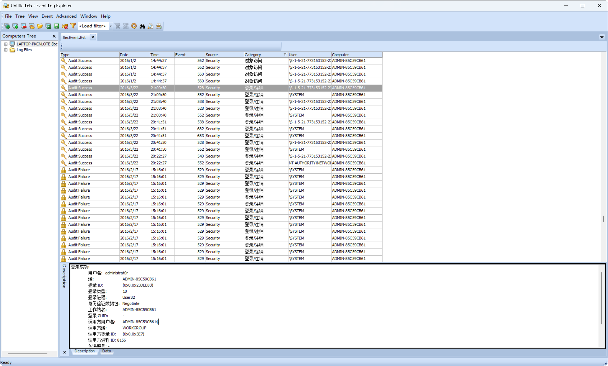 里面给到一种用Event Log Explorer分析的方法,载入后,筛选类型为登录/注销的日志,然后根据另外一个log日志的访问login相关界面的时间,缩小审计范围,之后可发现有