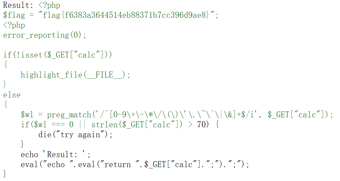 1 2 3 4 5 6 7 8 9 10 11 12 13 14 15 16 <?php error_reporting (0 );if (!isset ($_GET ["calc" ])) { highlight_file (__FILE__ ); } else { $wl = preg_match ('/^[0-9\+\-\*\/\(\)\'\.\~\^\|\&]+$/i' , $_GET ["calc" ]); if ($wl === 0 || strlen ($_GET ["calc" ]) > 70 ) { die ("try again" ); } echo 'Result: ' ; eval ("echo " .eval ("return " .$_GET ["calc" ].";" ).";" ); }